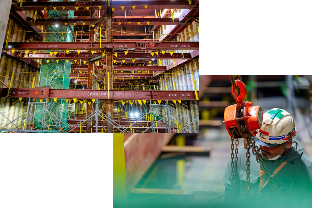 トンネル工事で掘削を行うとき、トンネル内部が崩れてこないように支えるための仮設構造物です。トンネルが完成すると無くなってしまう為、一般の人の目に触れる機会は少ないものの、トンネル工事には欠かせない重要な仮設施工になります。特殊な建設機械を使用し高度な技術で組立施工します。